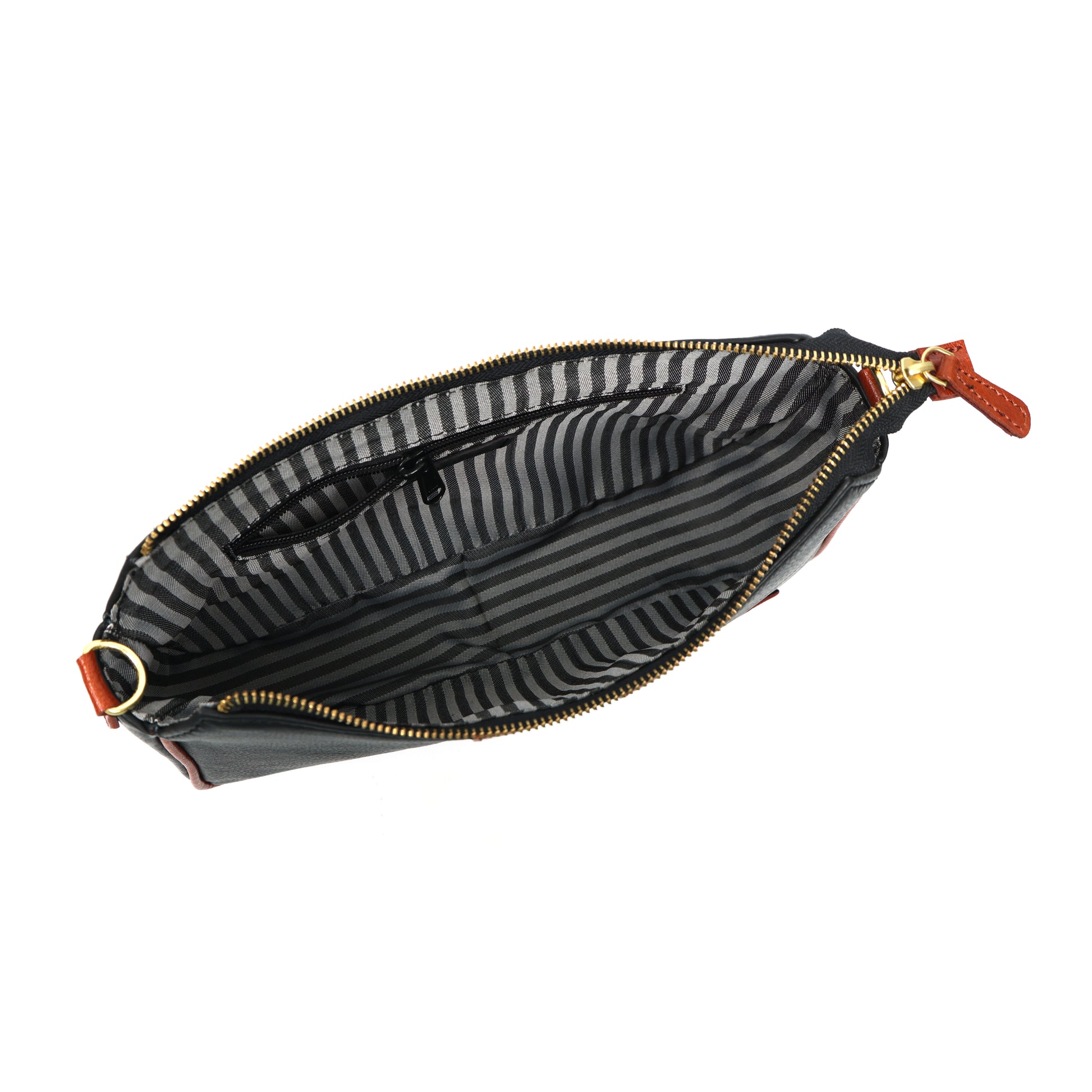 | Trendy crossbody sling bag in black with bold orange stripes. Lightweight and compact, includes adjustable strap and multiple pockets — ideal as a casual women sling bag or everyday shoulder accessory |