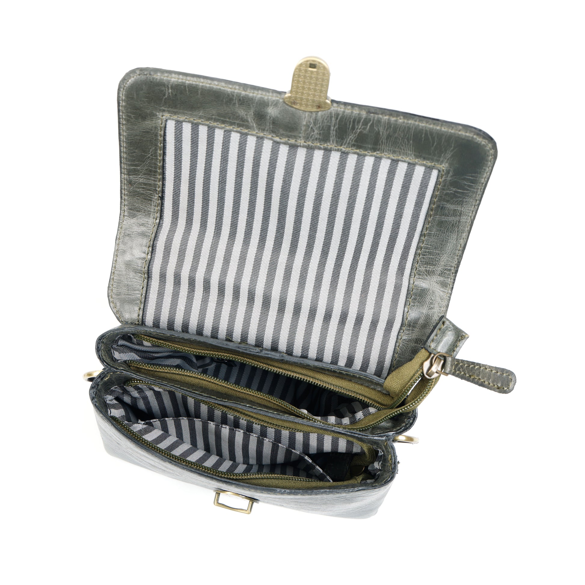 - Spacious compartment with striped lining and inner zip pocket.