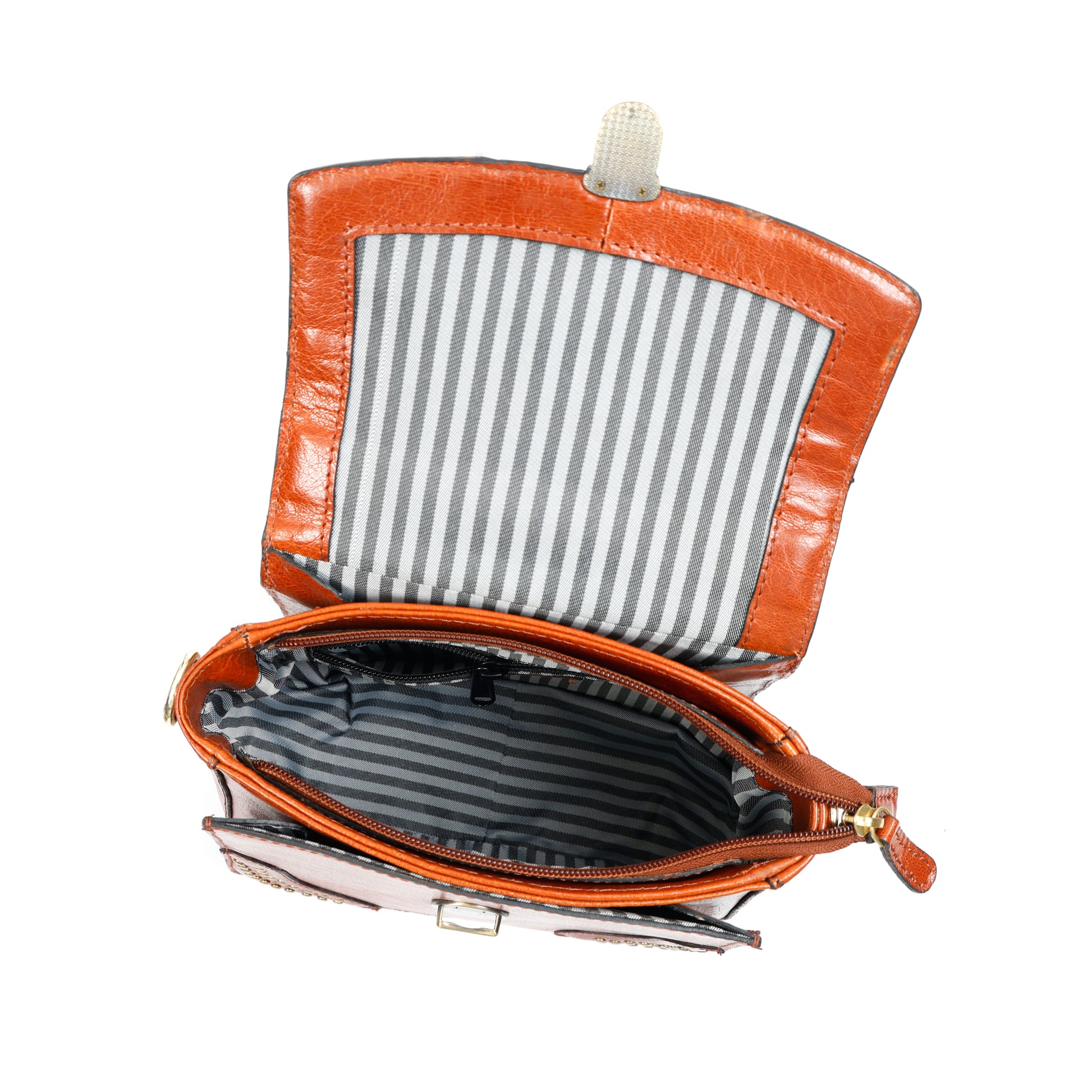 Vintage Leather Studded Top-Handle Sling Bag with Front Flap Lock & Multi-Pocket Interio